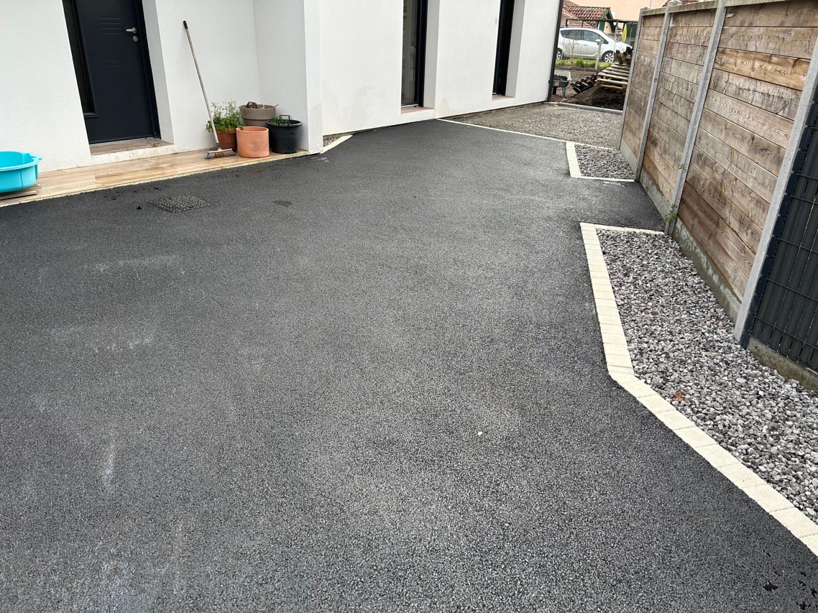 Découvrez ici une de nos créations exemplaires réalisée sur la commune de Mios : une magnifique allée en enrobé noir à chaud. Cet enrobé, connu pour sa résistance et sa finition impeccable, est sublimé par la pose de pavés Chinon structurés en motifs de carrés entrelacés. Sur le côté, nous avons également conçu une allée piétonne en gravillonnage stabilisé, un choix idéal pour un accès perméable et soigné, elle aussi délimitée avec élégance par la pose de pavés assortis.