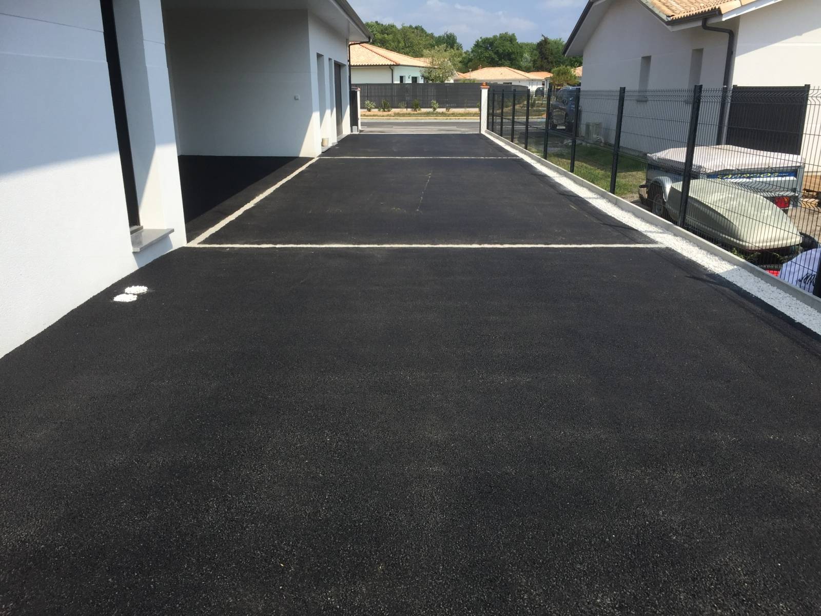 Dans le cadre de cette réalisation à Biganos, nous avons créé une allée en enrobé noir à chaud pour un rendu moderne et soigné, complétée par un pourtour de maison en pavés 12x12 gris. Ce type d’aménagement combine élégance et praticité, tout en assurant une protection durable des abords de votre habitation.
