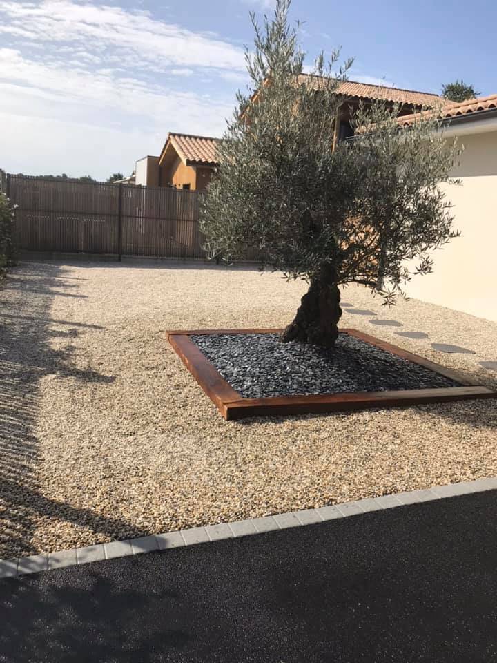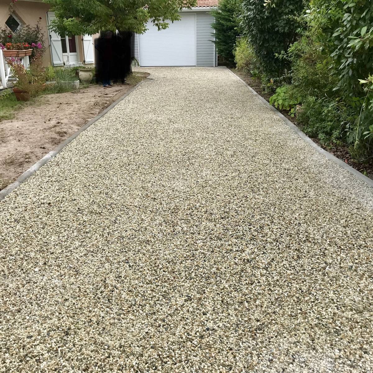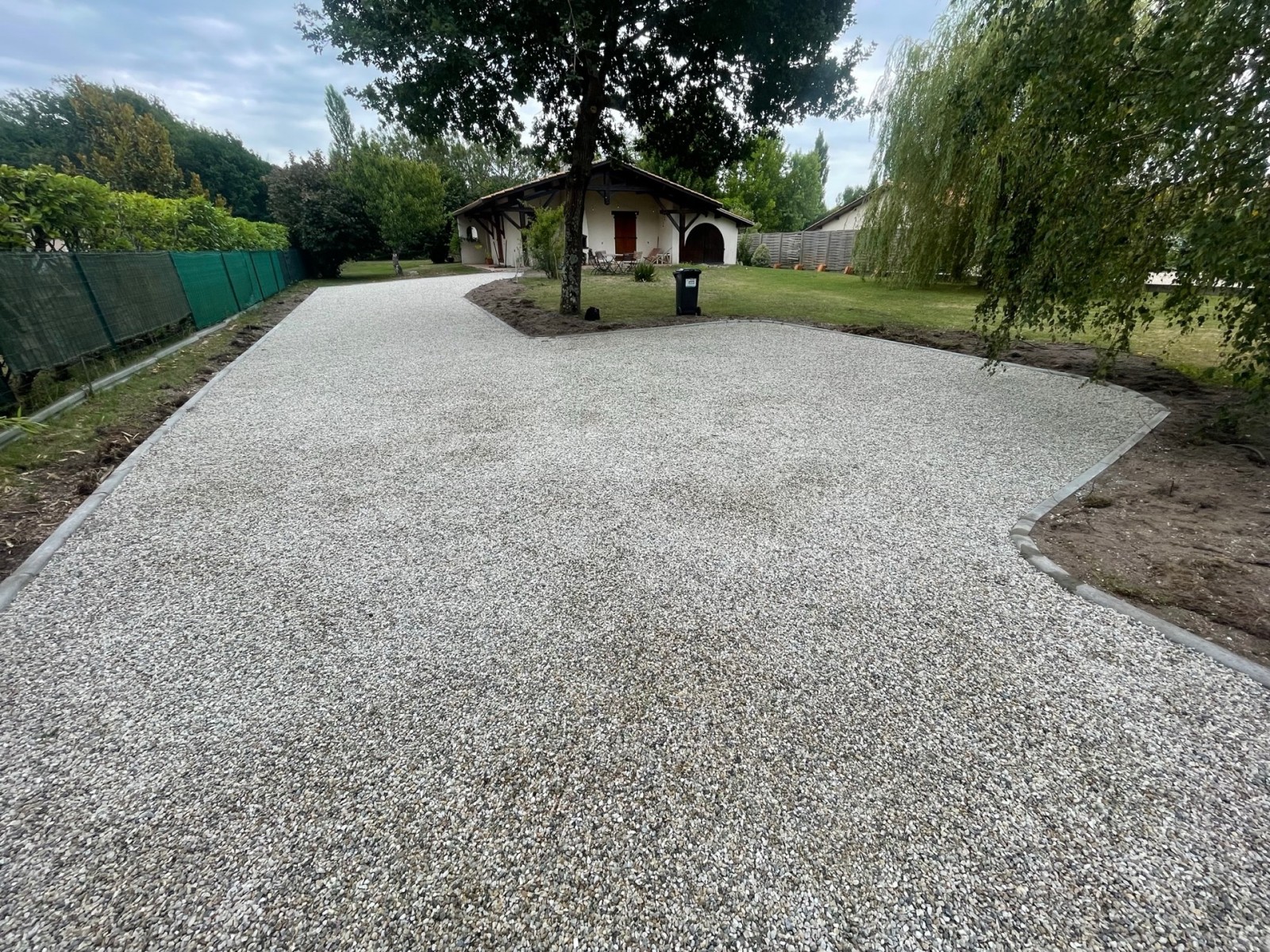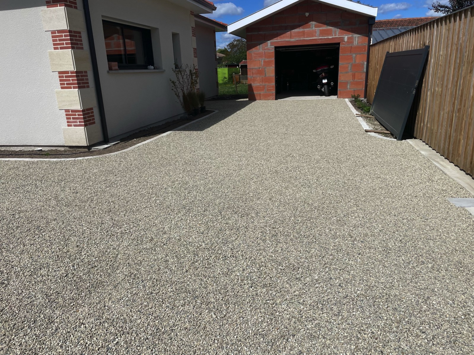 Ici, notre équipe a réalisé une allée en gravillonnage Garonne, communément appelée “allée en gravier”, sur la commune du Teich. Ce type de finition, à la fois esthétique et naturel, permet d’offrir un accès propre, stable et harmonieux à la maison. Le gravillon Garonne, apprécié pour ses teintes chaleureuses et sa résistance, s’intègre idéalement dans les environnements du Sud-Ouest.