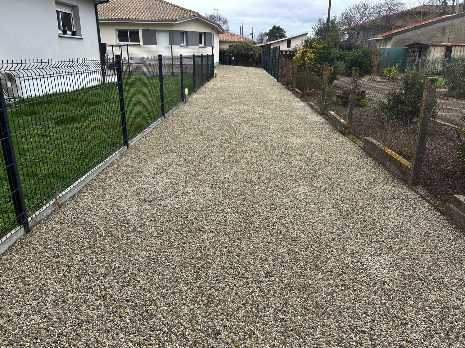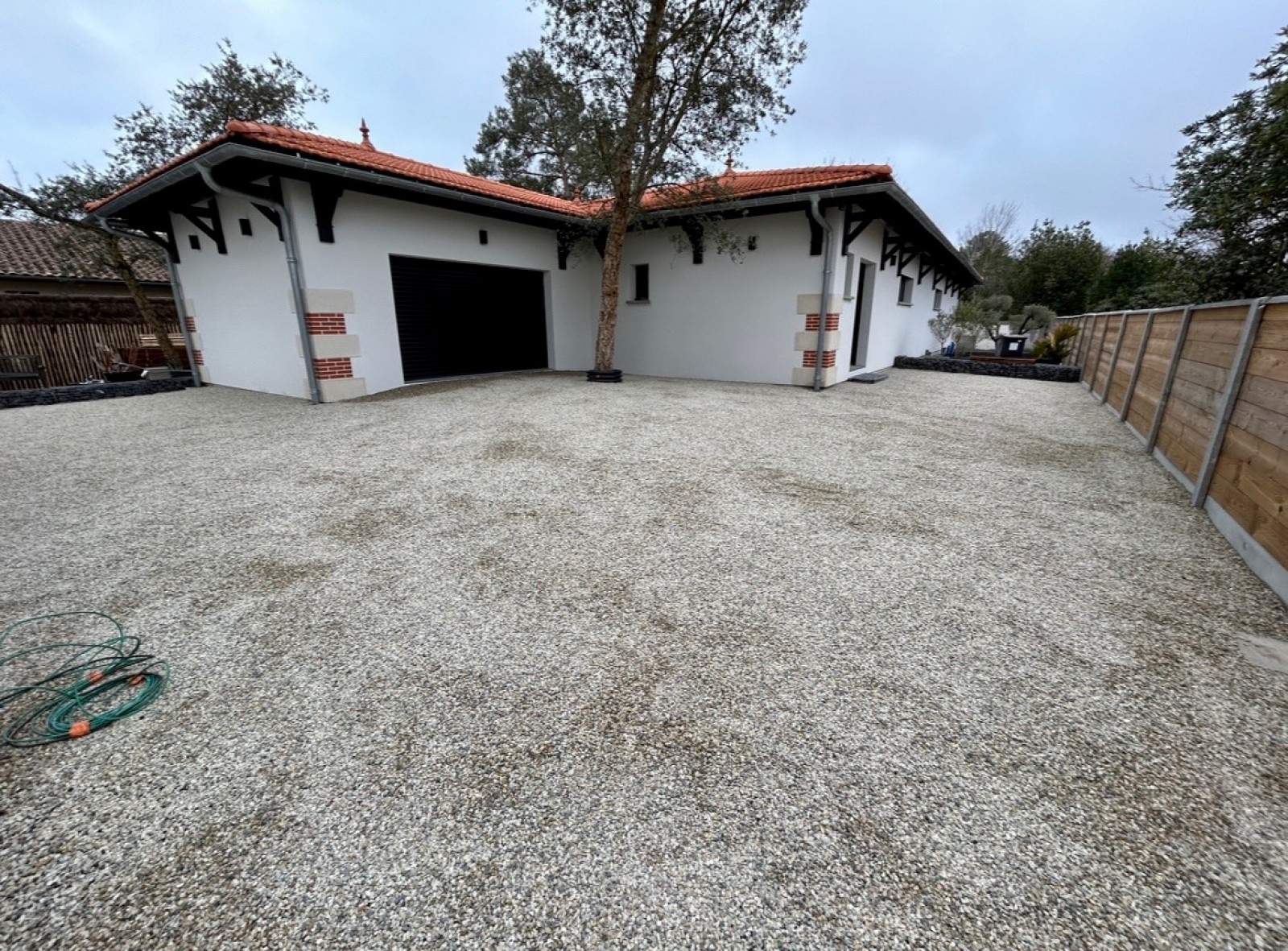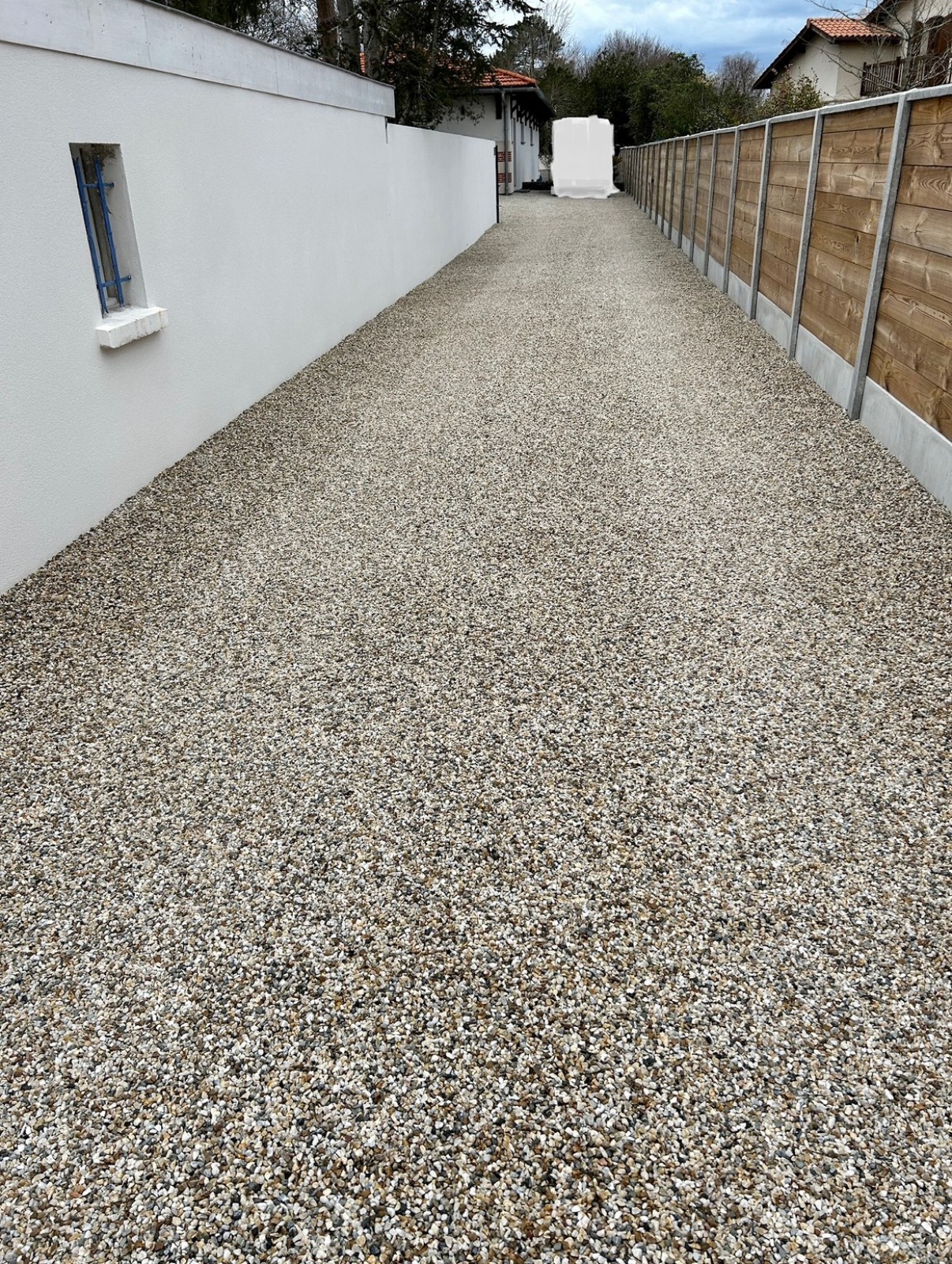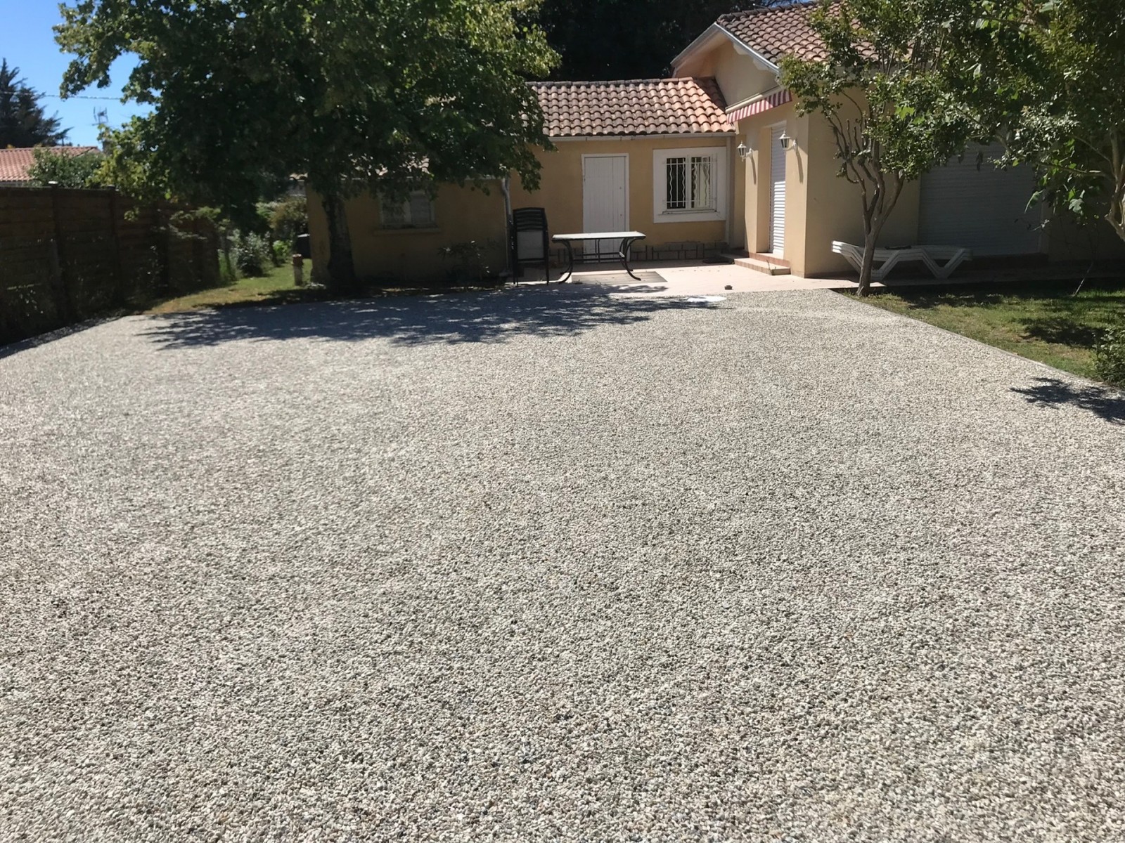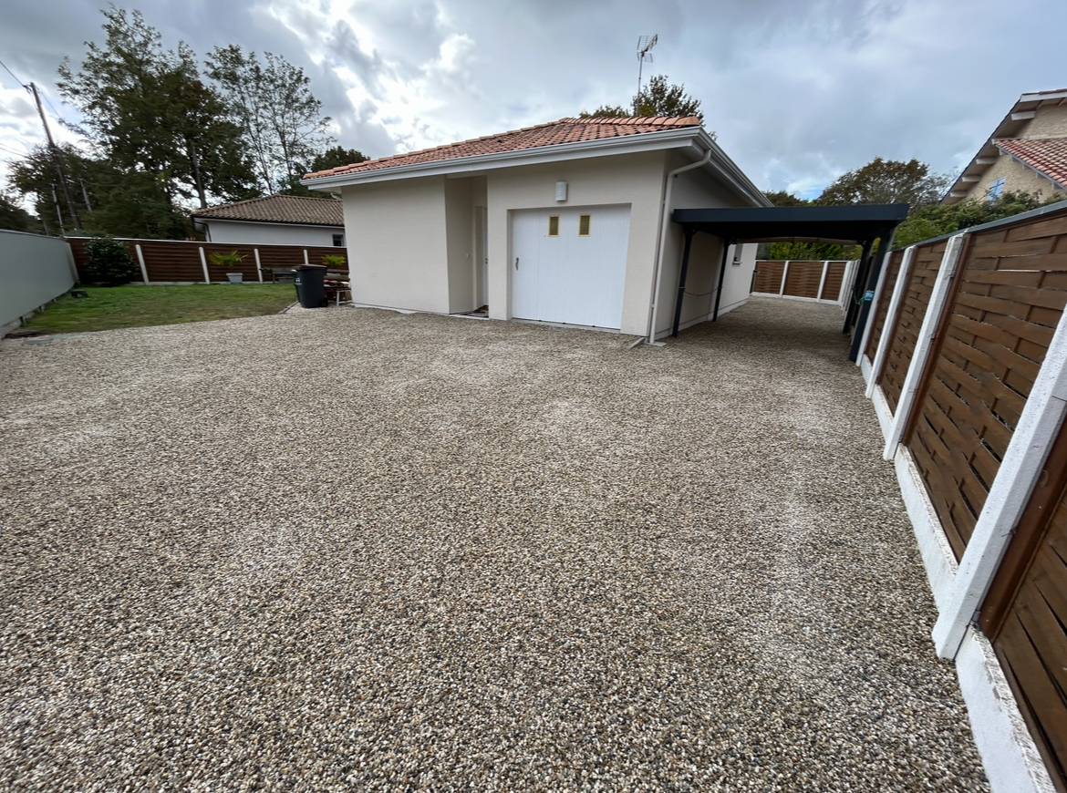 Pour la préparation nous effectuons un décaissage, une pose de géotextile, un apport de calcaire 0/20 Ophyte, compactage, pose du revêtement, et finition avec cailloux au choix du client ici finition garonne 6/10.