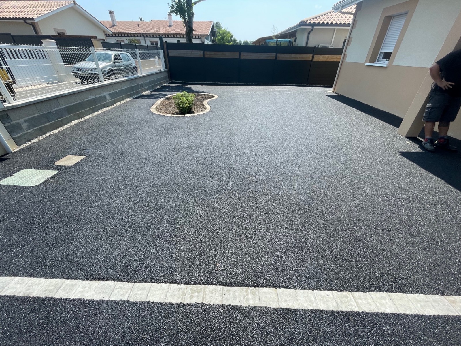 pour ce faire nous avons réalisé un décaissage du terrain une pose de Bidim puis la mise en place des bordures en pavés ton sable nous avons ensuite poser le revêtement de finition un enrobé noir ainsi qu’un gravillonnage 6/10 garonne.