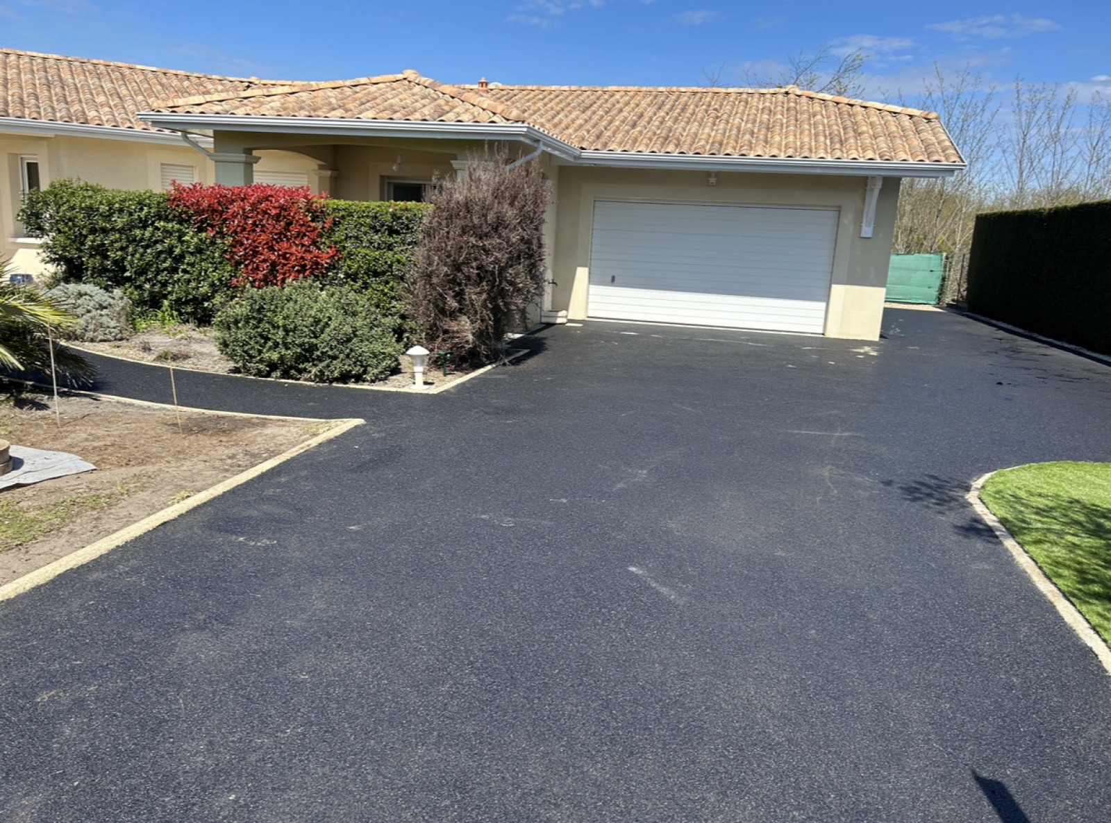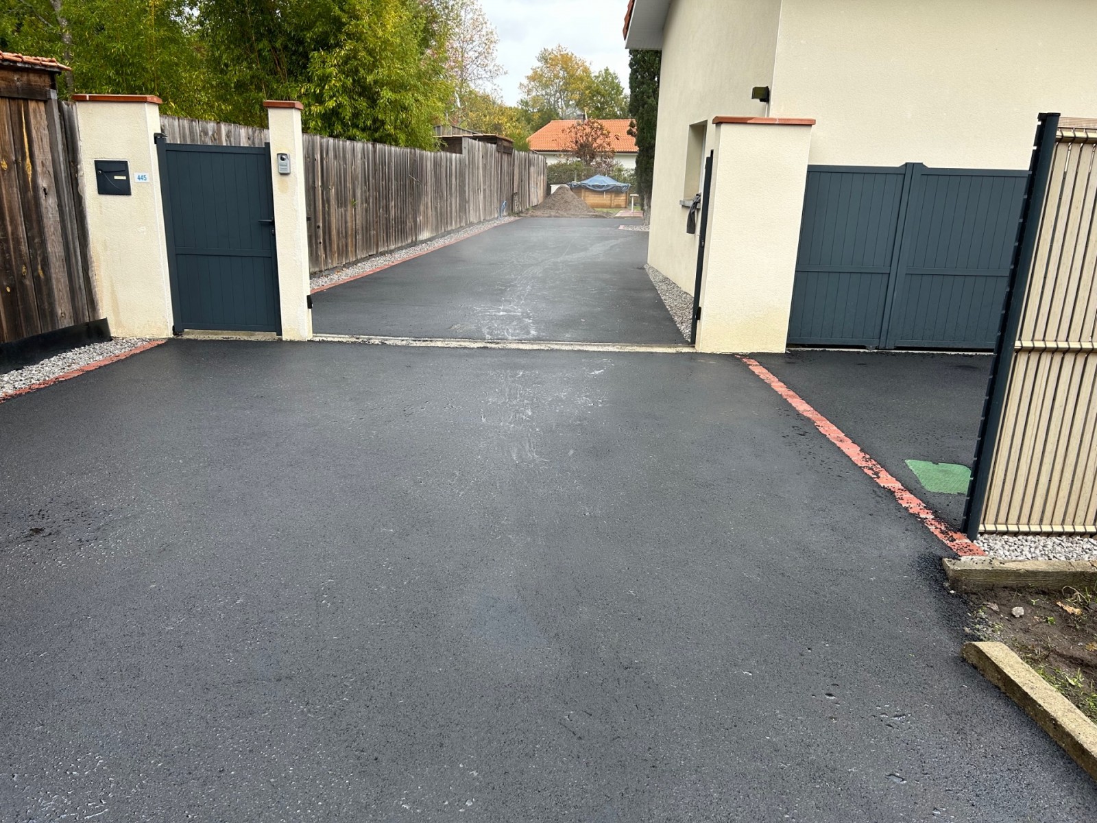 Sur ce chantier à Gujan-Mestras, nous avons réalisé un enrobé noir à chaud sur une allée existante. Les travaux ont commencé par un apport de calcaire afin de stabiliser la base, suivi de la pose de pavés 12x12 gris pour un encadrement soigné. Nous avons également installé des bordures béton P1, permettant de délimiter parfaitement l’espace et de garantir la tenue durable du revêtement. L’enrobé offre ici un rendu à la fois esthétique, propre et moderne, tout en facilitant l’entretien quotidien.