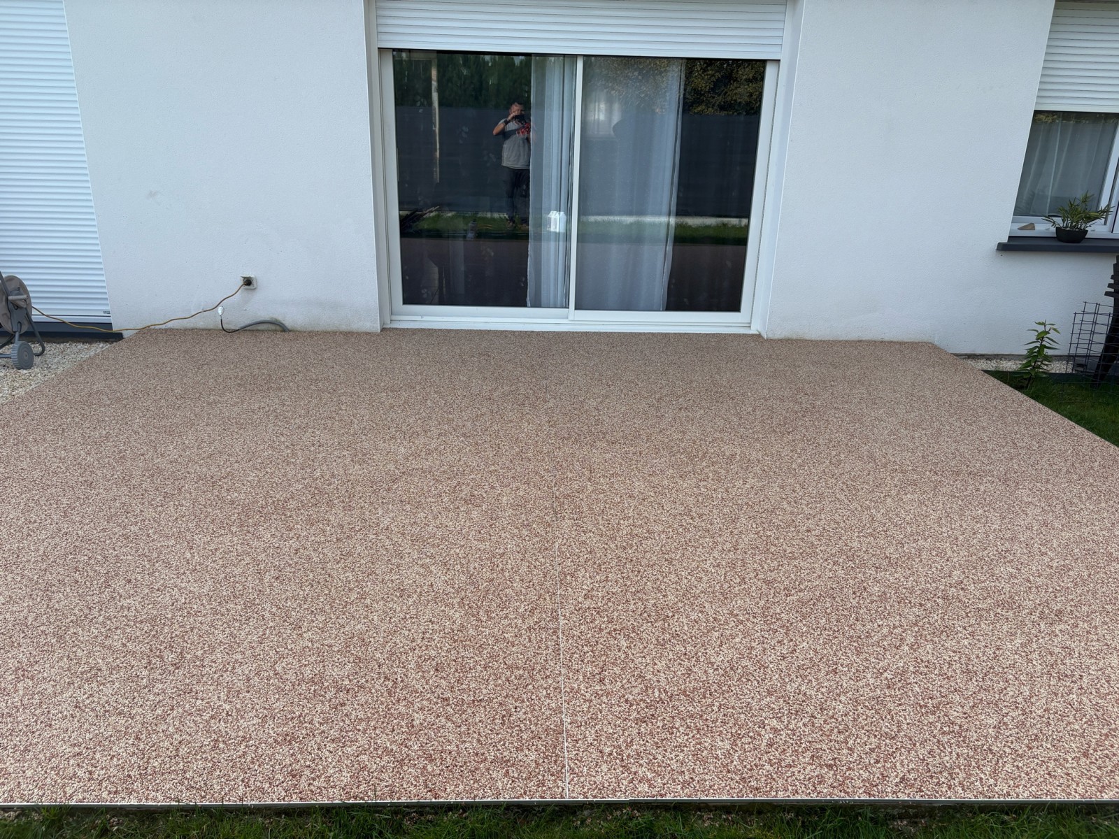 L’entreprise Lizé Yannick a réalisé ici une terrasse en moquette de pierre, résine drainante sur une dalle en béton existante.