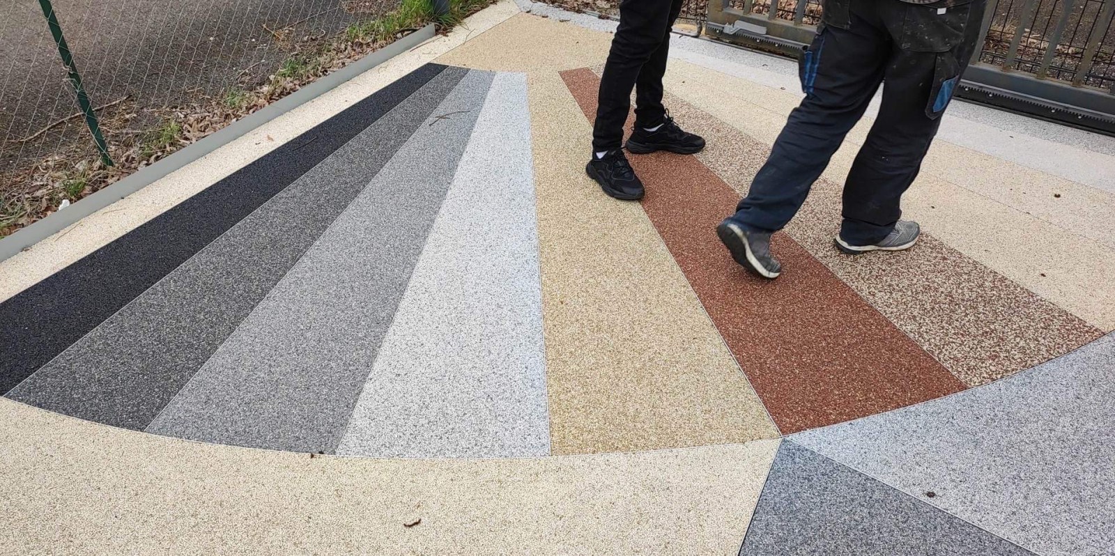 pour cette réalisation, nous avons effectué une pose de profiler sur les pourtours de la terrasse, appliquer une couche d’accroche, puis appliquer notre résine drainante couleur beige coraïl.