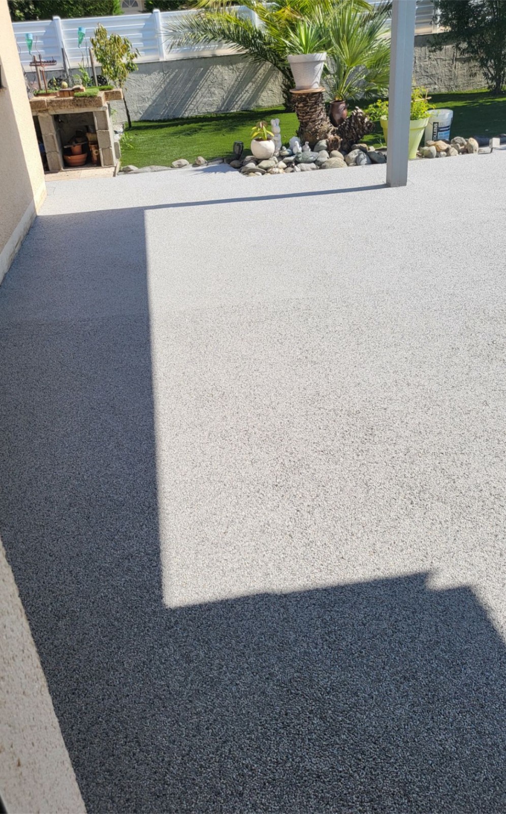 Pour cette réalisation nous avons coulé une dalle beton puis posé des profilés qui nous servent de bordures pour ensuite appliqué la moquette de pierre couleur gris claire.